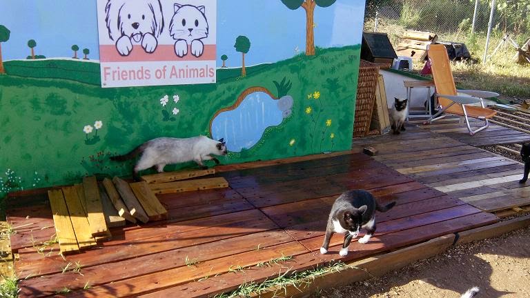 En estos momentos, nos centramos en la creación de superficies y pasillos de madera en los cuales los gatos y las dos perritas que viven con ellos, puedan estar secos si llueve, tomar el sol y pasear sin miedo a los abrojos que ahora están por toda la parcela.